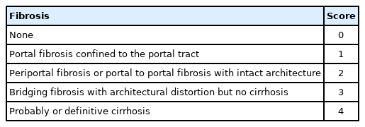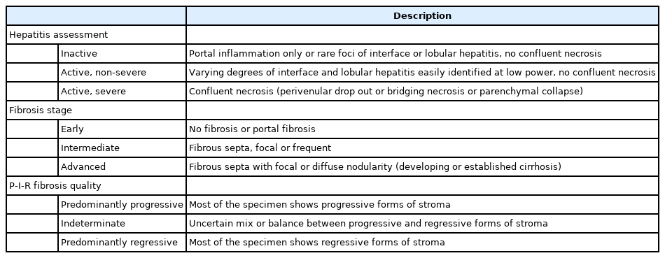 Besides a P-I-R score, liver biopsies are also graded and staged in the Beijing classification system (Table 2). Necroinflammation or hepatitis is graded as inactive (only portal inflammation or rare interface or lobular activity), non-severe active (variable interface and lobular hepatitis), and severe active (confluent necrosis, perivenular or bridging necrosis). Fibrosis is staged as early (no fibrosis, portal fibrosis), intermediate (focal or frequent fibrous septa, bridging fibrosis) and advanced (fibrous septa with focal or diffuse nodularity) [18]. The similarities to prior adopted grading and staging classification systems are evident. This new system for microscopic evaluation of grading and staging is susceptible to intra and interobserver variability, therefore, simplifying and decreasing the number of subcategories in grading activity and staging fibrosis improves reproducibility. Interobserver agreement between pathologists adopting the P-I-R staging system was high with a Kappa value of 0.71 (substantial agreement) [18,25]. The P-I-R system is also a valuable prognostic marker independent of the grade and stage, providing a snapshot for the current state of disease that strongly correlates with hepatic venous wedge pressures (hepatic venous pressure gradient [HVPG]) and portal hypertension [26]. In patients with chronic viral hepatitis, P, I, or R was an accurate surrogate marker for clinical outcome as successful eradication and clearance of hepatotropic viruses were predominantly R and unsuccessful treatments were predominantly P or I [18].