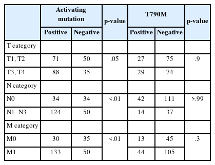 In patients who underwent plasma EGFR testing at the time of histological diagnosis, a positive plasma test result for activating mutations was associated with the presence of nodal or distant metastases (Table 4). Conversely, the detection of the T790M mutation in the plasma did not exhibit a correlation with either nodal status or distant metastasis (Table 4).