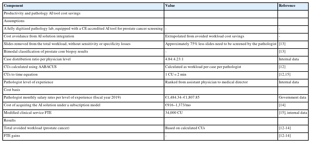 In this study, we have attempted to use a pre-existing workload assessment system, specifically the Automatable Activity–Based Approach to Complexity Unit Scoring (AABACUS) [12], with the aim of associating the outcomes of a pathology AI solution with meaningful financial figures. AABACUS was selected since it allocates complexity units (CU) to distinct diagnostic tasks for any given biopsy or resection specimen, including activities like surgical margin evaluation, quantitative interpretation of immunohistochemistry assays, and similar procedures, making it a frankly task-specific workload measurement tool thus suitable to evaluate the outcomes of different AI solutions, regardless of the specific task they perform in the diagnostic process. Notably AABACUS was previously incorporated in a study reporting the advantages of a multisite anatomic pathology informatics system, the most important being its enabling of a remote sub-specialty sign-out model of workflow [13]. The authors speculated that their suggested workflow model would increase efficiency and, in turn, reduce turnaround time and costs related to unnecessary testing and case transportation without, however, mentioning specific financial figures. Utilizing this tool, we opted to assess the prostate cancer screening tool developed by Campanella et al. [14]. The latter selection was made due to the software’s distinct impact, namely the reduction in workload for a pathologist by screening out hematoxylin and eosin (H&E) slides of prostate core biopsies not invaded by prostate adenocarcinoma.