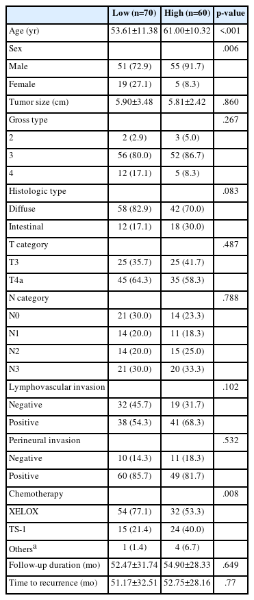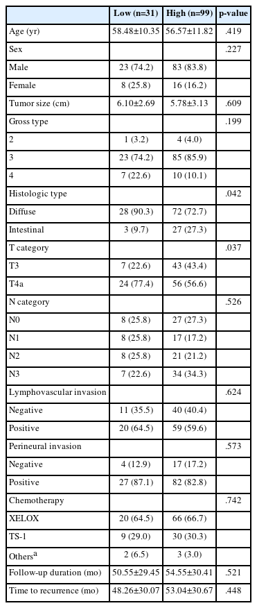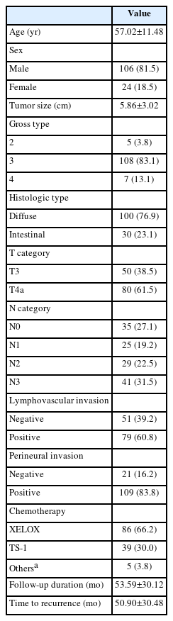 This retrospective study included 130 patients diagnosed with T3 or T4a advanced gastric cancer who underwent curative gastrectomy at Ulsan University Hospital between January 2014 and December 2019. Among an initial cohort of 292 patients, cases were excluded based on the following criteria: (1) presence of other primary malignancies, (2) positive intraoperative peritoneal lavage cytology, (3) M1 category at the time of diagnosis, or (4) involvement of the resection margin. Clinical and pathological data were retrieved from electronic medical records and included patient age, sex, tumor size, gross morphology, histologic type, TNM stage, lymphovascular invasion, perineural invasion, resection margin status, and results of abdominal washing cytology. TNM staging was based on the 8th edition of the American Joint Committee on Cancer (AJCC) classification system [18]. Tumor gross type was categorized according to the Borrmann classification [19], and histological subtype was classified based on the Lauren classification [20].