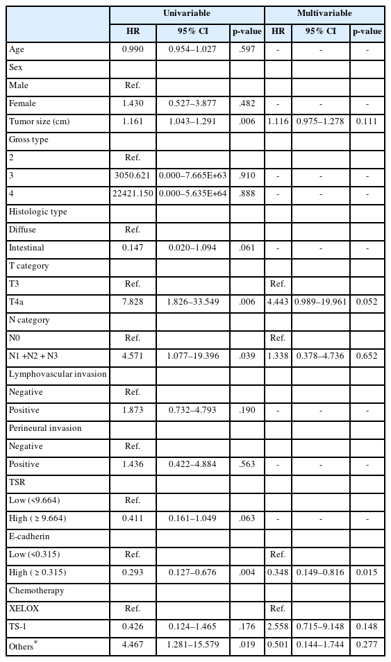 To identify clinicopathologic variables independently associated with peritoneal recurrence in advanced gastric cancer, a multivariable Cox proportional hazards regression analysis was conducted (Table 5). Variables included in the model were age, sex, tumor size, gross type, histologic subtype, T category, N category, lymphovascular invasion, perineural invasion, TSR, E-cadherin expression, and adjuvant chemotherapy regimen. In univariate analysis, tumor size (hazard ratio [HR], 1.161; 95% confidence interval [CI], 1.043 to 1.291; p = .006), T category (T4a vs. T3; HR, 7.828; 95% CI, 1.826 to 33.549; p = .006), N category (N0 vs. N1 + N2 + N3; HR, 4.571; 95% CI, 1.077 to 19.396; p = .039), E-cadherin (high vs. low; HR, 0.293; 95% CI, 0.127 to 0.676; p = 0.004), and chemotherapy regimen (others vs. XELOX; HR, 4.467; 95% CI, 1.281 to 15.579; p = .019) were statistically significantly associated with increased risk of peritoneal recurrence. However, in the multivariable model, only E-cadherin expression remained statistically significant (high vs. low; HR, 0.348; 95% CI, 0.149 to 0.816; p =.015), indicating that high E-cadherin expression was associated with a statistically significantly lower risk of peritoneal recurrence compared to low expression. Although T category did not reach statistical significance in the multivariable model (p = .052), its p-value was close to the threshold, suggesting a potential prognostic relevance that warrants further investigation.
