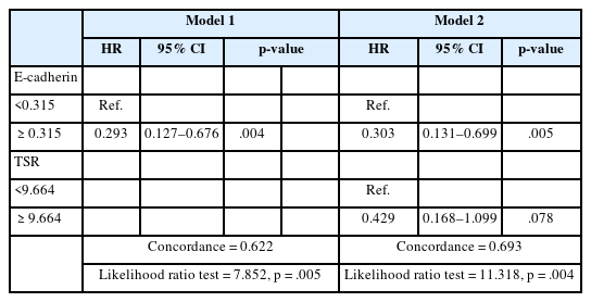 To identify a better predictive model for peritoneal recurrence, we compared the prognostic performance of two models: model 1, based on E-cadherin expression alone, and model 2, which incorporated both E-cadherin and TSR. The concordance index of model 1 was 0.622, with a likelihood ratio test value of 7.852 (p = .005). In model 2, the concordance index increased to 0.693, and the likelihood ratio test value was 11.318 (p = .004), indicating improved predictive performance with the addition of TSR. Detailed results are in Table 6.