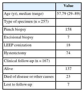 Overall, HPV-IDCM account for 4.4% (257/5,854) of all cases and 3.6% (208/5,805) of primary cervical malignancies (Fig. 1). Patient age of HPV-IDCM ranged from 29 to 89 years, with a median of 57.79 years. Of the 257 cases, the most common specimen type was punch biopsy (n = 158), followed by hysterectomy (n = 74), loop electrosurgical excision procedure conization (n = 18), and other excisions (n = 7). Among the 167 patients with available follow-up data, 137 were alive, 23 had died (due to disease or other causes), and seven were lost to follow-up (Table 1).
