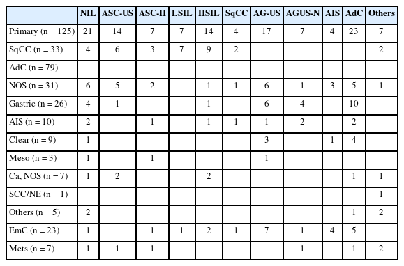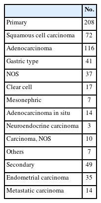 Histologic subtypes were as follows; primary adenocarcinoma (n = 116), which comprised gastric (n = 41), NOS (n = 37), clear cell (n = 17), mesonephric (n = 7), adenocarcinoma in situ (AIS) (n = 14); endometrial adenocarcinoma (n = 35); SqCC (n = 72); metastatic carcinoma (n = 14); carcinoma, NOS (n = 10); neuroendocrine carcinoma (n = 3); and other histological malignancies (n = 7) (Table 2).