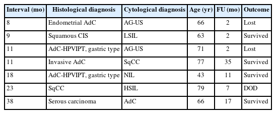 Of the matched cases, 148 (95.5%) received histological confirmation within 6 months, while seven cases experienced diagnostic delays from 7 to 38 months (Table 4). In our cohort, one patient with gastric-type adenocarcinoma had three abnormal cytology reports (AG-US, favor neoplastic and 2 times of ASC-H [atypical squamous cells, cannot exclude high-grade intraepithelial lesion]) and two negative HPV tests before a definitive diagnosis was made via hysterectomy 11 months later. (Fig. 3)