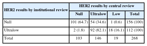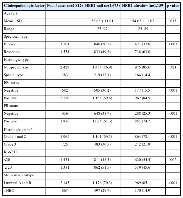 | Clinicopathologic factor | No. of cases (n=2,812) | HER2-null (n=1,673) | HER2-ultralow (n=1,139) | p-value |