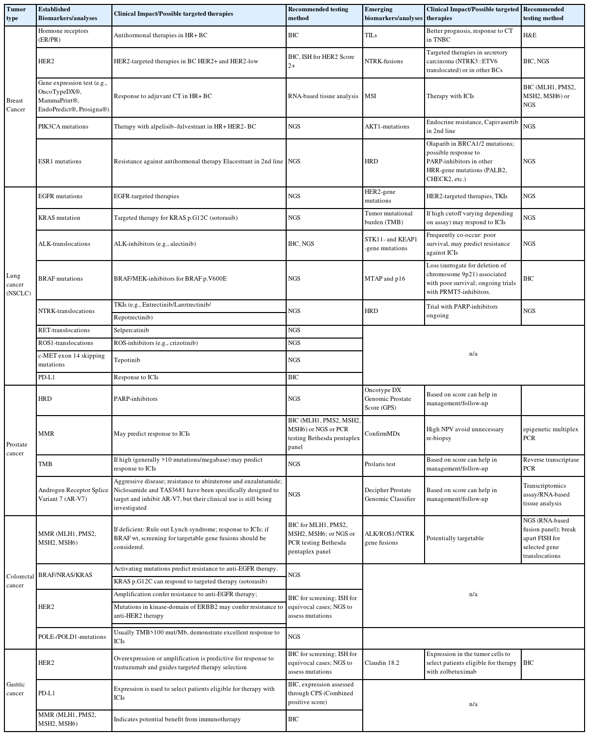 | Tumor type | Established Biomarkers/analyses | Clinical Impact/Possible targeted therapies | Recommended testing method | Emerging biomarkers/analyses | Clinical Impact/Possible targeted therapies | Recommended testing method |