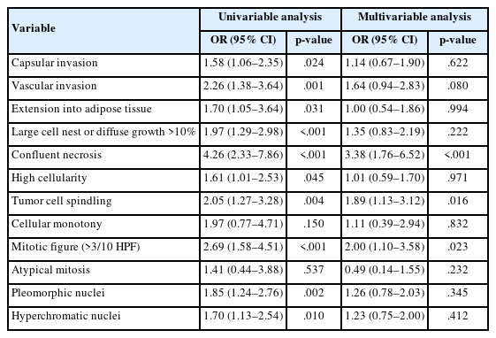 Multivariable logistic regression analysis was conducted on 560 samples with available PASS parameter scoring to evaluate the association between individual PASS parameters and adverse events (Table 5). Among the PASS parameters, only confluent necrosis, tumor cell spindling, and mitotic figures (>3 per 10 high-power fields [HPF] were statistically significant. Specifically, confluent necrosis was associated with an OR of 3.38 (95% CI, 1.76 to 6.52; p < .001), tumor cell spindling with an OR of 1.89 (95% CI, 1.13 to 3.12; p =.016), and mitotic figures (>3/10 HPF) with an OR of 2.00 (95% CI, 1.10 to 3.58; p = .023). These three parameters were included in the 3-factor Simple PASS, while vascular invasion—despite its marginal significance (OR, 1.64; 95% CI, 0.94 to 2.83; p = .080)—was added to the 4-factor Simple PASS. This decision took into account that other scoring systems, such as GAPP (grading of adrenal pheochromocytoma and paraganglioma) and COPPS (COmposite Pheochromocytoma/paraganglioma Prognostic Score), also incorporate vascular invasion as a parameter [5,18].