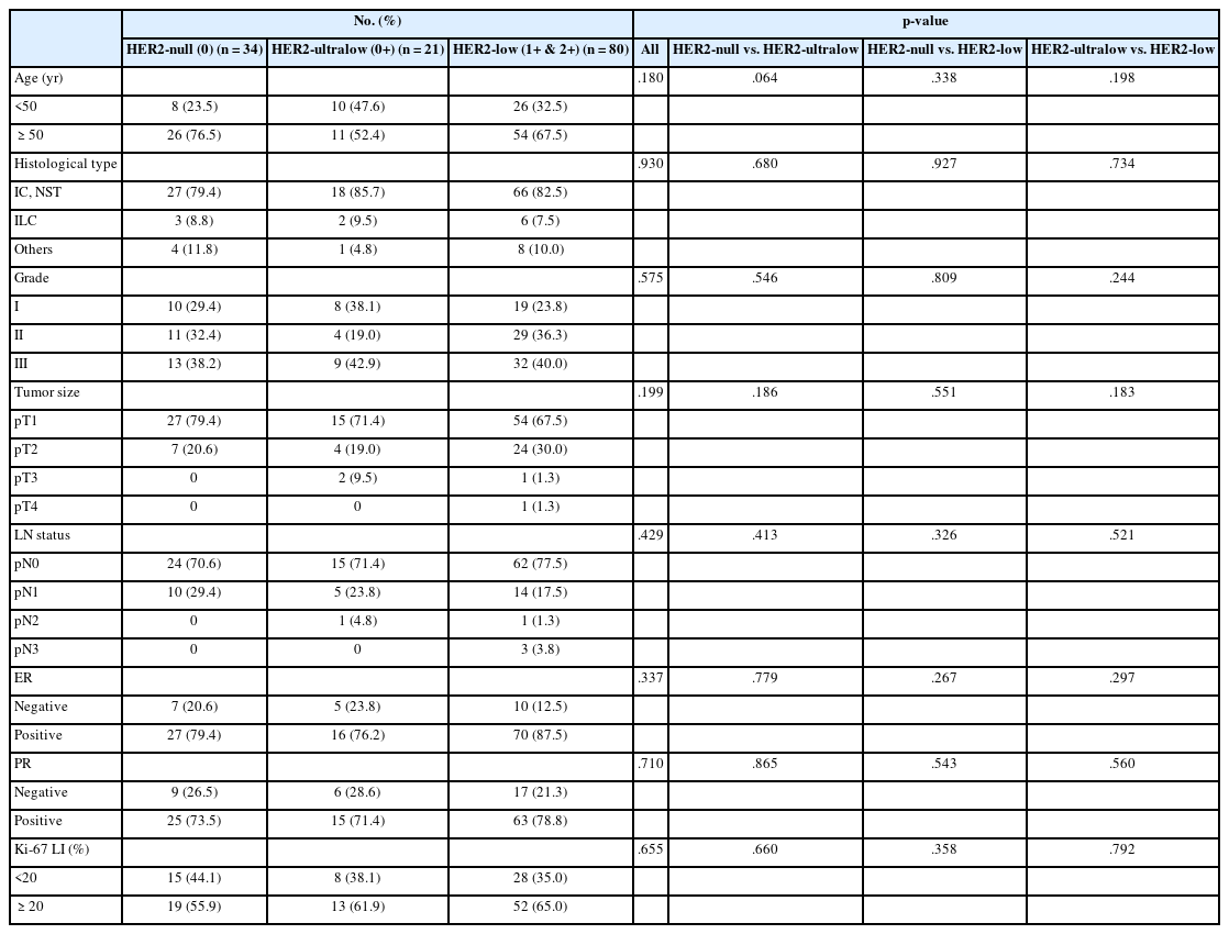 - During the study period, 176 patients were diagnosed with BC and underwent surgery. Of these, 15 patients were excluded due to HER2 positivity, 16 due to the unavailability of HER2 IHC slides, and 10 because their tumors measured less than 0.5 cm, resulting in a final study population of 135 patients. The distribution of HER2 IHC scores in the study cohort was as follows: HER2 0 in 34 patients (25.2%), 0+ in 21 (15.6%), 1+ in 50 (37.0%), and 2+ in 30 (22.2%). Clinicopathologic characteristics of the patients are summarized in Table 1. All variables, including age, histologic type, histologic grade, tumor size, lymph node status, HR expression, and Ki-67 labeling index, did not differ significantly among the HER2-null (0), HER2-ultralow (0+), and HER2-low (1+ and 2+) groups (Table 2).