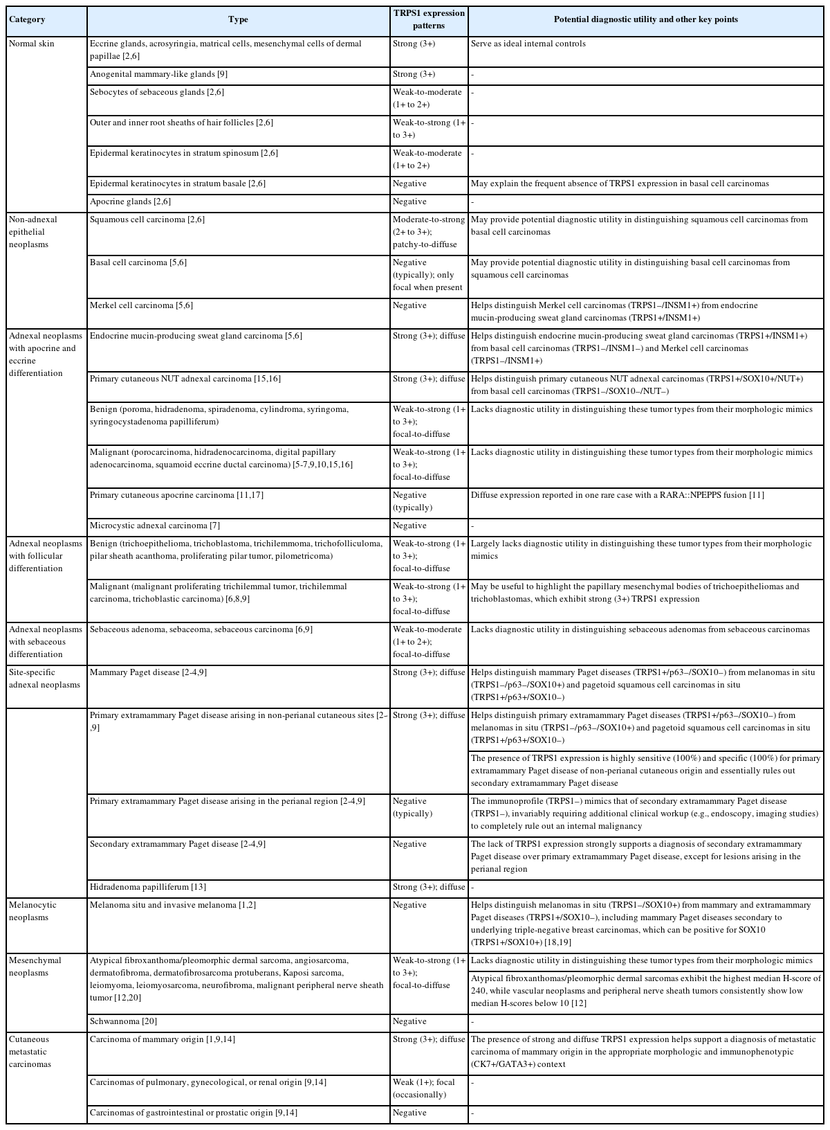 In this review, we provide the most comprehensive and up-to-date examination of the utility and limitations of TRPS1 IHC in cutaneous neoplasms, encompassing not only adnexal tumors but also other epithelial and mesenchymal neoplasms of cutaneous origin. This knowledge will deepen our understanding of this emerging marker in dermatopathology and offer guidance on how to optimally integrate TRPS1 IHC with other established immunohistochemical markers to improve diagnostic accuracy in routine dermatopathology practice.