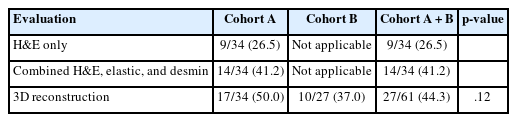 Evaluation of VI with 2D H&E only and a combination of H&E, elastic, and desmin staining was available only in cohort A. Subsequently, the prevalence of VI in cohort A was evaluated by H&E staining alone, combined H&E, elastic, and desmin staining, and 3D reconstruction. The prevalence of VI was 9/34 (26.5%) in H&E only, 14/34 (41.2%) in a combination of H&E, elastic, and desmin staining, and 17/34 (50.0%) in 3D evaluation (Table 2). The combination of H&E, elastic, and desmin staining showed higher VI detection rates than in H&E slide evaluation alone; however, this difference did not reach statistical significance (p = .200). The difference in VI frequency between a combination of H&E, elastic, and desmin staining and 3D evaluation did not reach statistical significance (p = .465). However, 3D evaluation detected VI more frequently than in 2D H&E slide evaluation alone (p = .046). No significant difference in the prevalence of VI by 3D evaluation was observed between cohort A and cohort B (17/34, 50.0% vs. 10/27, 37.0%; p = .120) (Table 2).