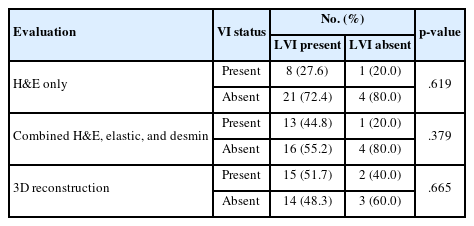 Since lymphovascular invasion is composed of lymphatic invasion and VI, we compared the lymphovascular invasion status in the surgical pathology report with the reevaluated VI status using H&E only, combined H&E, elastic, and desmin staining, and 3D reconstruction (Table 3). The proportion of VI of the lymphovascular invasion in cohort A was gradually increased from 27.6% (8/29) evaluated by H&E only, 44.8% (13/29) by combined H&E, elastic, and desmin staining, to 51.7% (15/29) by 3D reconstruction.