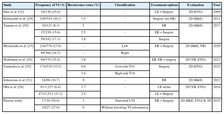 In recent years, the examination of VI in CRCs has attracted considerable interest, especially regarding its effects on disease progression and patient outcomes. Table 5 summarizes that several prior studies have shown varying prevalence of VI, exhibiting significant discrepancies in recurrence rates and diagnostic criteria. The previous studies indicated up to 20% of VI in pT1 CRCs [29-31]. The incidence of VI detected by 2D H&E staining in the present study was 26.5% (9/34), which is comparable to the previous studies. The incidence of VI was higher when assessed using surgical resection specimens compared to EMR or ESD specimens in the previous study. These data may suggest varying inclusion criteria for the high risk of recurrence in surgical resection specimens.