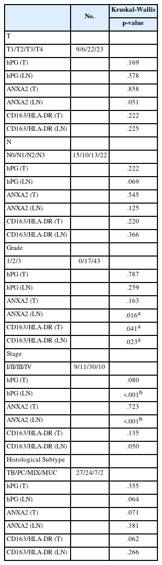 hPG and ANXA2 expression, the hPG/ANXA2 ratio, and the CD163/HLA-DR ratio in T and LN tissues were studied in relation to common clinicopathological parameters (T and N, grade, stage, and histological subtype). All the parameters were distributed into their respective subcategories. A Kruskal-Wallis non-parametric ANOVA was performed to assess whether groups differed significantly. This investigation was expanded with Dunn’s test with Bonferroni adjustment to ensure that the adjusted p-values retained their significance.