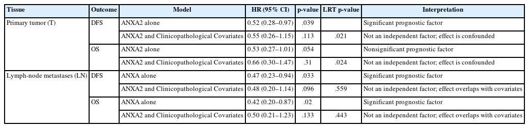 In the univariable analysis of the primary tumors (T), low ANXA2 expression (H-score ≤ 100) showed a statistically significant association with longer DFS (hazard ratio [HR], 0.52; 95% confidence interval [CI], 0.28 to 0.97; p = .039) and a non-significant association with improved OS (HR, 0.53; 95% CI, 0.27 to 1.01; p = .054). However, in the multivariable analysis, those associations were attenuated and became non-significant (DFS: HR, 0.55; p = .110; OS: HR, 0.66; p = .310). Moreover, the LRTs were significant (DFS LRT p = .02; OS LRT p = .024), indicating that the block of clinical covariates provided significantly more prognostic information than the ANXA2-only model. Therefore, the prognostic effect of ANXA2 in T tissues is not independent and is largely explained by other clinicopathological variables.