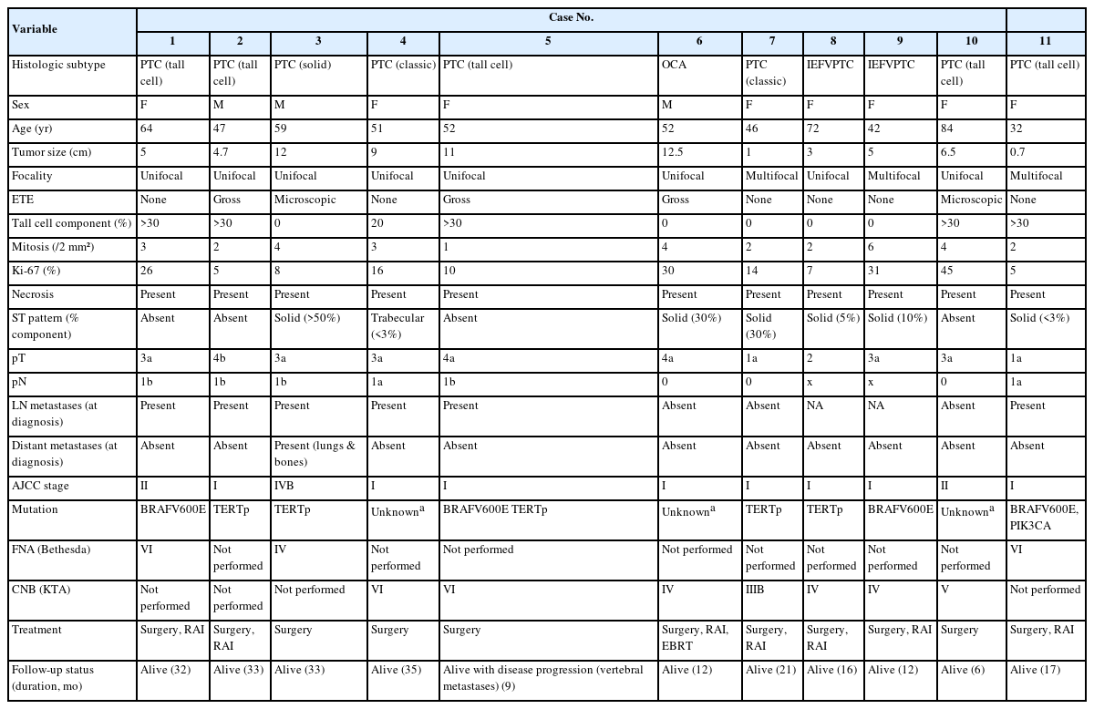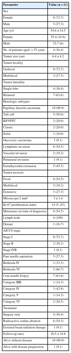 | Histologic subtype | PTC (tall cell) | PTC (tall cell) | PTC (solid) | PTC (classic) | PTC (tall cell) | OCA | PTC (classic) | IEFVPTC | IEFVPTC | PTC (tall cell) | PTC (tall cell) |