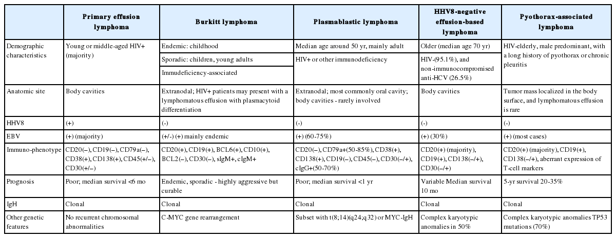 | Primary effusion lymphoma | Burkitt lymphoma | Plasmablastic lymphoma | HHV8-negative effusion-based lymphoma | Pyothorax-associated lymphoma | |