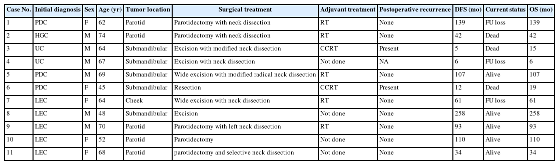 DFS, disease-free survival; OS, overall survival; PDC, poorly differentiated carcinoma; RT, radiation therapy; FU, follow-up; HGC, high-grade carcinoma; UC, undifferentiated carcinoma; CCRT, concurrent chemoradiation therapy; NA, not available; LEC, lymphoepithelial carcinoma.