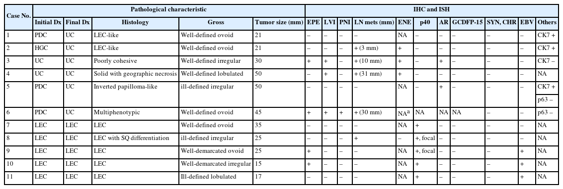 IHC, immunohistochemistry; ISH, in situ hybridization; Dx, diagnosis; EPE, extraparenchymal extension; LVI, lymphovascular invasion; PNI, perineural invasion; LN, lymph node; ENE, exranodal extension; AR, androgen receptor; GCDFP-15, gross cystic disease fluid protein 15; SYN, synaptophysin; CHR, chromogranin; EBV, Epstein-Barr virus; PDC, poorly differentiated carcinoma; UC, undifferentiated carcinoma; LEC, lymphoepithelial carcinoma; NA, not available; CK7, cytokeratin 7; HGC; high-grade carcinoma; SQ, squamous.