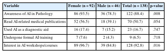 The survey revealed high levels of awareness regarding AI’s role among pathologists, with 88.4% of respondents acknowledging its growing importance. Sex-based differences were found to be statistically significant, with females exhibiting greater awareness than males (93.5% vs. 78.3%, p = .008) as shown in Table 1.