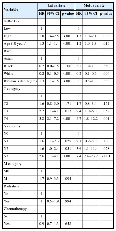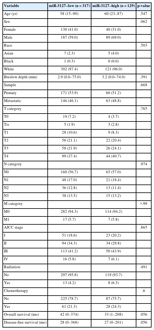 miRNA, mRNA sequencing, DNA methylation data, and clinical information of cutaneous melanoma cases were downloaded from the Human Cancer Atlas – Skin Cutaneous Melanoma (TCGA-SKCM). miR-3127 expression was classified into miR-3127–low and miR-3127–high clusters using maximally selected rank statistics.