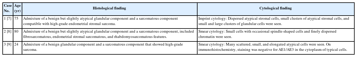 Three published reports describing the cytological findings of uterine adenosarcoma were identified [7-9]. Two were derived from the endometrium, and one was derived from the uterine cervix. The histological and cytological features of the three cases are summarized in Table 1.
