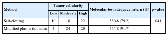Tumor cellularity was evaluated in CB sections of 48 paired samples diagnosed with non–small cell lung cancer, as this subgroup is most commonly considered for targeted therapy. Adequacy for molecular testing was defined as having more than 200 tumor cells and a tumor cell fraction ≥10%. The SC method demonstrated an adequacy rate of 79.2% (38/48), whereas the MPT method achieved an adequacy rate of 91.7% (44/48). A statistically significant difference in adequacy rates was observed between the two methods (p = .041). The tumor cellularity distribution for both methods is presented in Table 3.