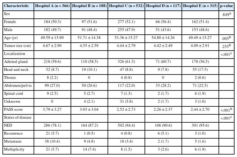 Five tertiary referral centers in Korea participated in this multi center study investigating the prognostic factors for paragangliomas. The participating institutions were Seoul National University Hospital (SNUH), Seoul National University Bundang Hospital (SNUBH), Samsung Medical Center (SMC), Seoul St. Mary’s Hospital, and Severance Hospital. All data were fully anonymized and merged prior to analysis, so that investigators were blinded to the identity of the contributing institutions.