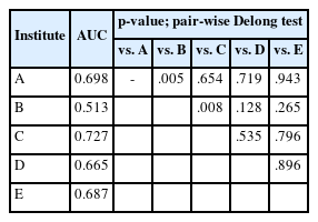 The PASS is composed of multiple histopathological parameters, many of which lack quantitative or objective criteria. As a result, concerns have been raised regarding inter-observer variability in its application [8,9]. To further assess this issue, the predictive performance of the PASS for adverse events was evaluated across five different hospitals. The AUC for each institution was as follows: hospital A, 0.698; hospital B, 0.513; hospital C, 0.727; hospital D, 0.665; and hospital E, 0.687 (Fig. 2C). Pairwise DeLong tests revealed statistically significant differences in AUC between hospital A and hospital B, as well as between hospital B and hospital C (p < .05) (Table 4). These findings indirectly demonstrate inter-observer variability in the application of the PASS score, or at the very least, highlight discrepancies in its predictive performance among different institutions.