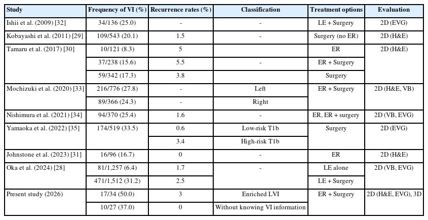 In recent years, the examination of VI in CRCs has attracted considerable interest, especially regarding its effects on disease progression and patient outcomes. Table 5 summarizes that several prior studies have shown varying prevalence of VI, exhibiting significant discrepancies in recurrence rates and diagnostic criteria. The previous studies indicated up to 20% of VI in pT1 CRCs [29-31]. The incidence of VI detected by 2D H&E staining in the present study was 26.5% (9/34), which is comparable to the previous studies. The incidence of VI was higher when assessed using surgical resection specimens compared to EMR or ESD specimens in the previous study. These data may suggest varying inclusion criteria for the high risk of recurrence in surgical resection specimens.
