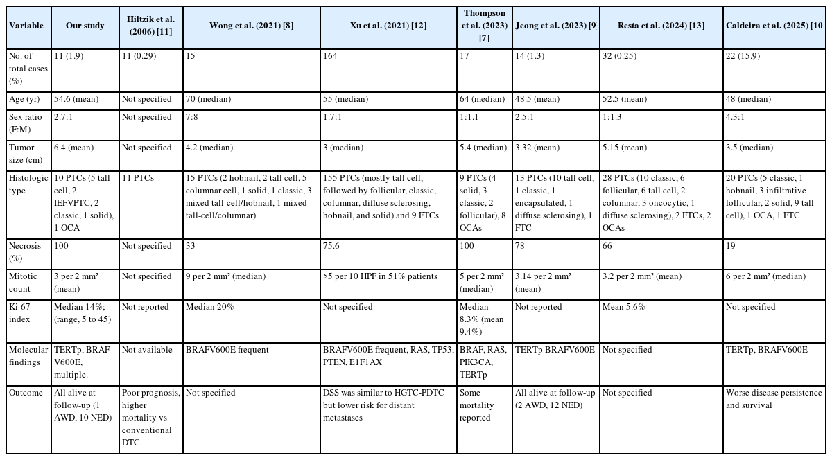 Histologic subtypes observed in our cohort were primarily PTC, including tall cell, IEFVPTC, solid, and classic subtypes, along with one case of OCA. These findings are broadly consistent with those reported in prior studies (Table 3). Most series demonstrate a predominance of aggressive PTC subtypes such as tall cell, hobnail, and columnar cell, though the presence of OCA and FTC has also been variably reported [7-10,12,13]. Although our study did not identify any cases of the diffuse sclerosing subtype of PTC, prior studies have reported a series of HGDTC cases exhibiting this subtype [9,12,13,16,17].