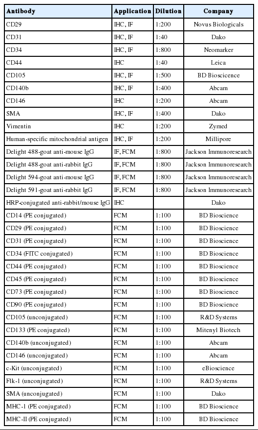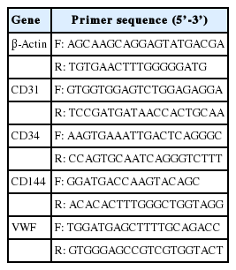 Subcultured cells were induced into adipogenic and osteogenic cells as described previously.5 Adipogenic or osteogenic differentiation was determined with Oil Red O (Sigma) or Alizarin Red (Sigma) stainings, respectively. To determine the EC differentiation potential, subcultured cells were seeded on fibrin hydrogel and induced with 20 ng/mL vascular endothelial growth factor (VEGF; R&D Systems, Minneapolis, MN, USA) or conditioned media. Endothelial cell differentiation was determined by capillary-like network formation and expression of EC-specific markers. The tube length and the branching points of the capillary-like structure were measured with the photoplanimetric method using Image J (NIH). The expression of EC-specific proteins and mRNAs was determined by immunofluorescent staining and by quantitative real-time reverse transcriptase polymerase chain reaction, respectively. The primers used in this experiment are listed in Table 2.