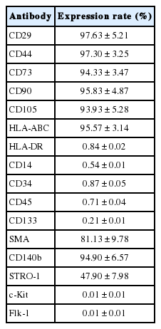 The immunophenotype of the subcultured cells was analyzed with a FACSCalibur (Becton Dickinson, San Jose, CA, USA). After the cells were incubated with primary or isotype-matched antibodies, the cells were washed with phosphate buffered saline and fixed. For unconjugated antibodies, the signal was detected after incubation with fluorochrome-conjugated secondary antibodies. Isotype-matched immunoglobulin was used as a negative control. A minimum of 10,000 events were acquired for each analysis.